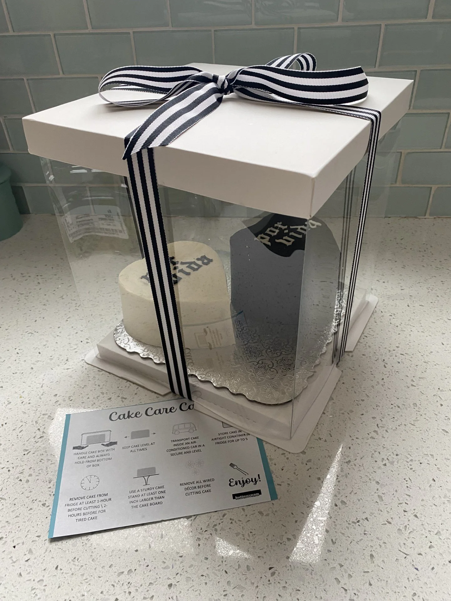 Top tier: 4” diameter with 4 layers of cake | Bottom tier: 5” diameter with 5 layers of cake. Price starts at $175.